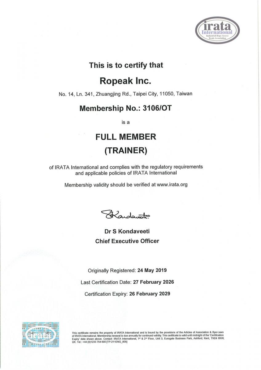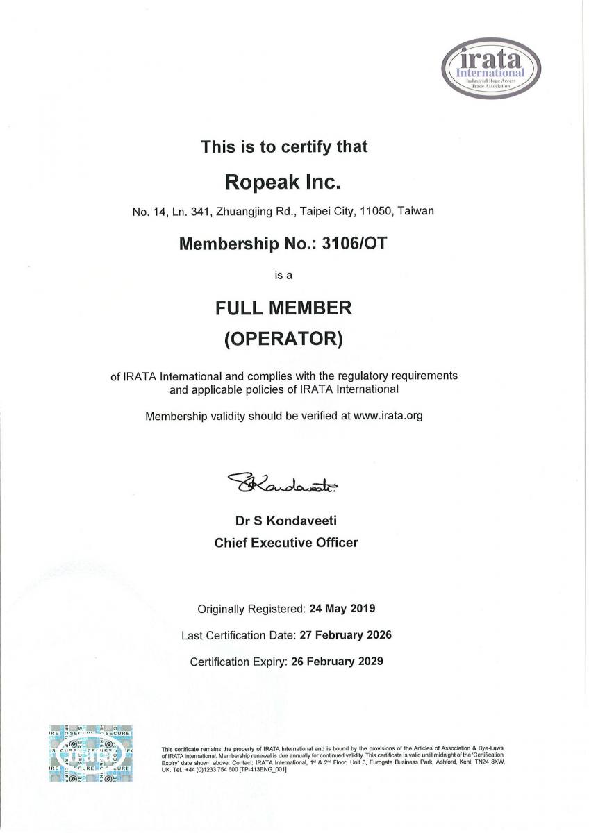 本公司為IRATA會員公司,接受IRATA協會之監督及審核,以確保內部管理制度符合IRATA體系之嚴格要求,並確實遵循規範及執行。